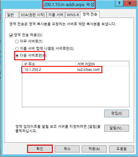 3. DNS 보조 서버에도 역방향이 동기화 될 수 있게 설정한다.
