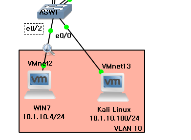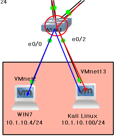 - 스위치에 10.1.10.4(Window7)와 10.1.10.100(Kali Linux)이 연결되어 있다.