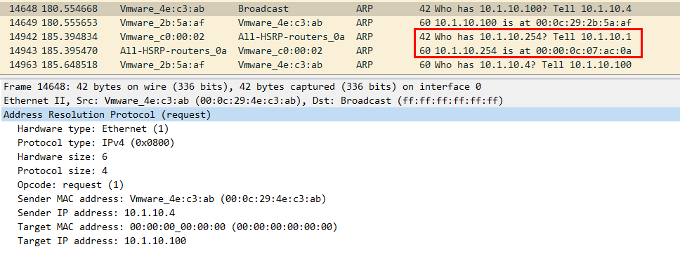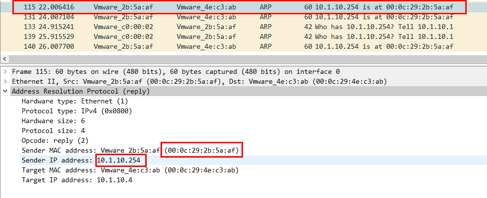 - 패킷을 보면 10.1.10.254에 ARP Request를 보냈을 때 Gateway의 MAC 주소가 00:00:0 c:07:ac:0a라는 것을 알려준다.