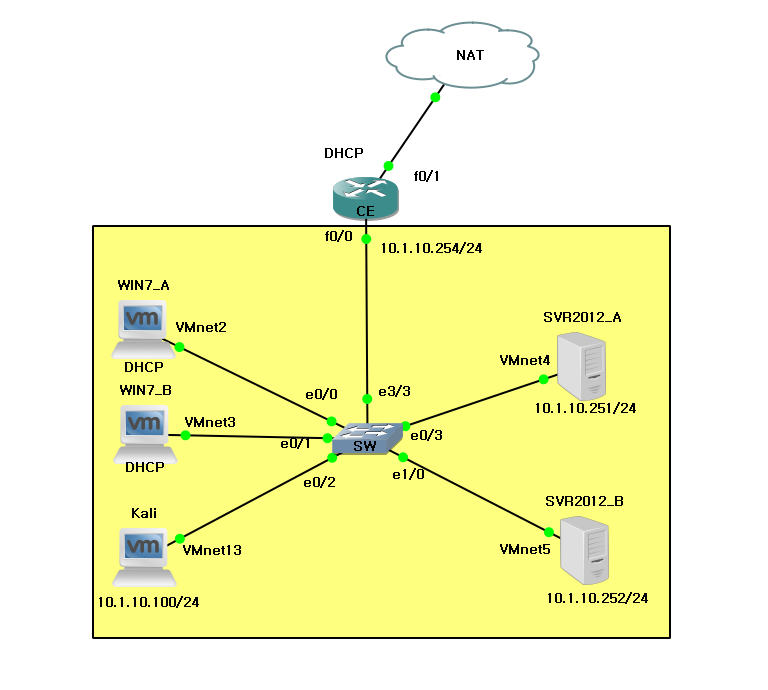 - 2대의 Client(WIN7_A와 WIN7_B)는 윈도우 DHCP 서버(10.1.10.252)에서 DHCP IP를 할당받는다.