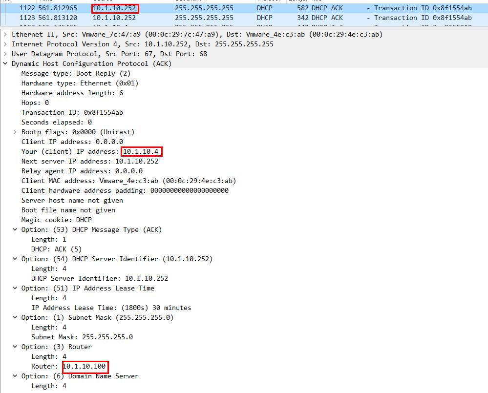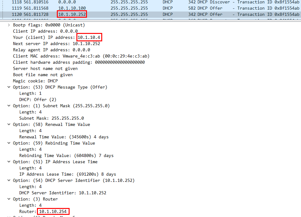 - DHCP Server IP의 패킷은 DHCP 할당 대역이 10.1.10.2~20이고 Gateway 주소는 10.1.10.254으로 설정되어 있다.