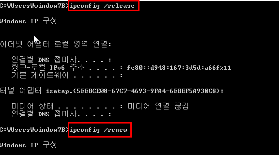 - ipconfig /release → ipconfig /renew 명령어를 통해서 DHCP 주소를 재할당받는다.
