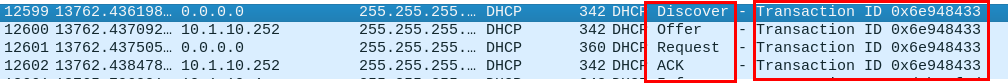 - Kali Linux에서 Target PC가 DHCP 요청을 하면 DHCP 서버에서 Broadcast 메시지가 전송되므로 아래와 같이 클라이언트의 MAC 주소와 Transaction ID를 확인할 수 있다.