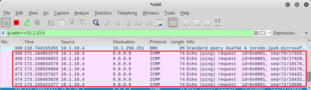- Attacker PC IP의 패킷은 DHCP 할당 대역이 10.1.10.10~20이고 Gateway 주소는 10.1.10.100으로 설정되어 있다.