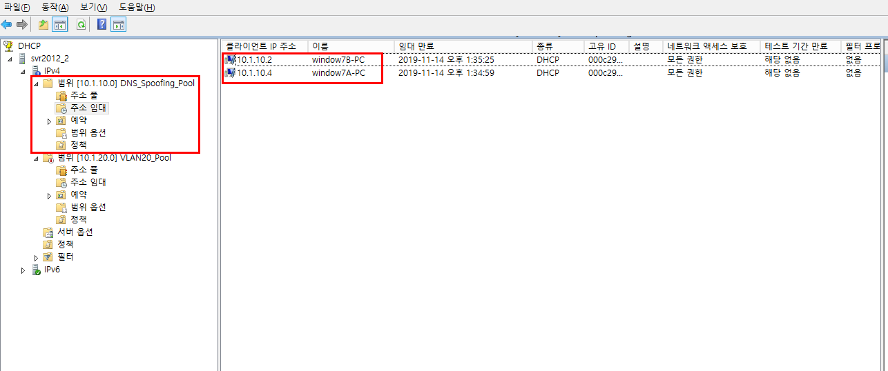 - DHCP를 각 Client PC에서 등록 후 등록된 DHCP 정보가 서버에 정상적으로 등록되었는지 확인한다.