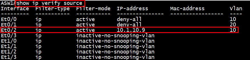 ASW1(Switch)에 IP Source Guard 구성