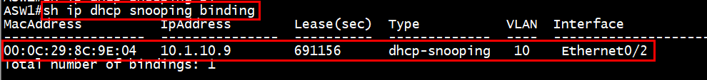 2. show ip dhcp snooping binding 명령어 사용