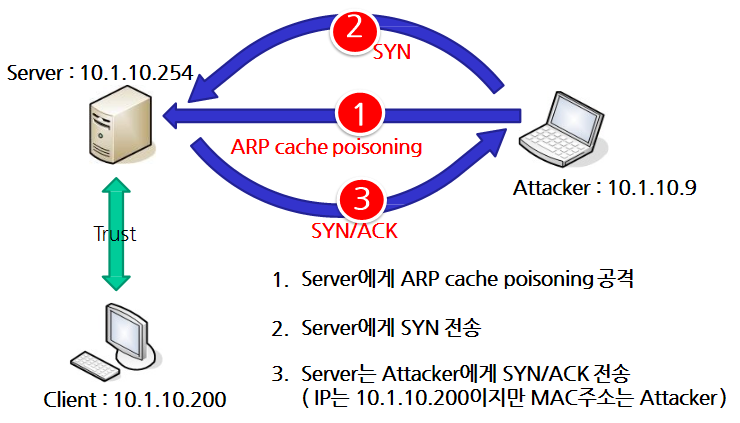 - Attacker PC에서 자신의 IP 주소를 서버와 신뢰하고 있는 Client의 IP 주소로 변경한 후 서버에 접속할 수 있다.