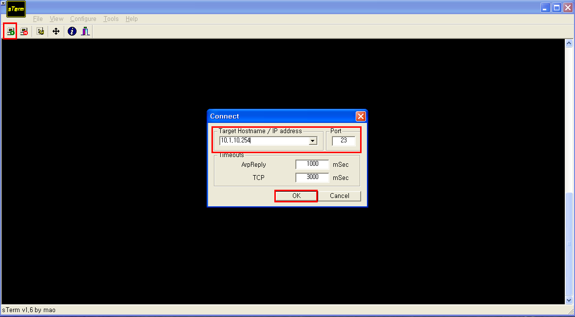 2. 접속버튼을 클릭한 후 DSW2(Switch)에 Telnet 포트번호로 접속한다.