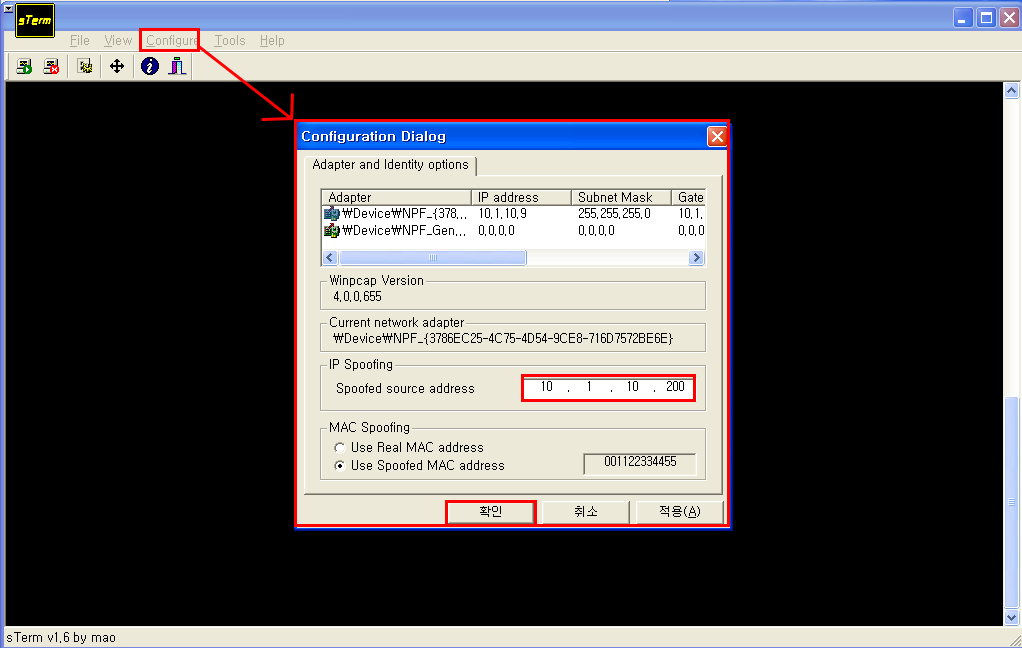 1. Configure 메뉴를 클릭한 후 IP Spooing 주소를 Client IP 주소로 설정한다.