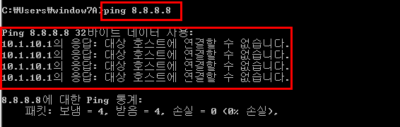 - Admin(Window7_A) 에서는 외부로 통신이 되지 않는것을 확인할 수 있다.
