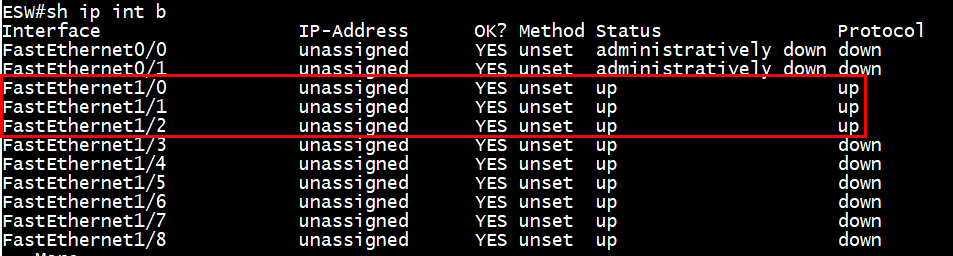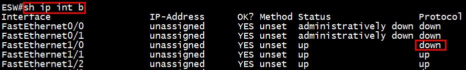 - show ip interface brief 명령어를 사용하면 fa 1/0 포트가 down 된 것을 확인할 수 있다.