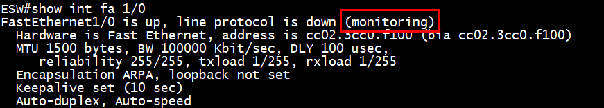 - show interface fa 1/0으로 확인해보면 down 된 이유가 모니터링 포트로 지정되었기 때문이다.
