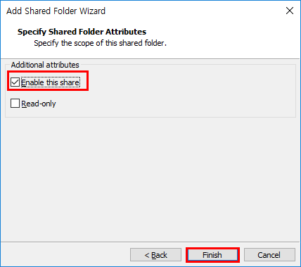 - enable this share버튼을 체크한 후 finish버튼을 눌러서 설정을 완료한다.